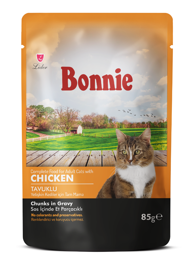 Bonnie, tariflerindeki tüm bileşenler ve ham maddeler, yüksek kalitelerini sağlamak için düzenli olarak test edilir ve yalnızca güvenilir ve sertifikalı tedarikçilerimizden temin edilir. Kediler doğal olarak etoburdur. Çok seçicidirler ve kalite söz konusu olduğunda kandırılamazlar. Kediler, bitki bileşenlerinden gerekli tüm besinleri kullanamazlar. Bu nedenle Bonnie, Tavuk gibi taze, etli malzemelerden özel olarak hazırlanma yetişkin kedi konservesidir.