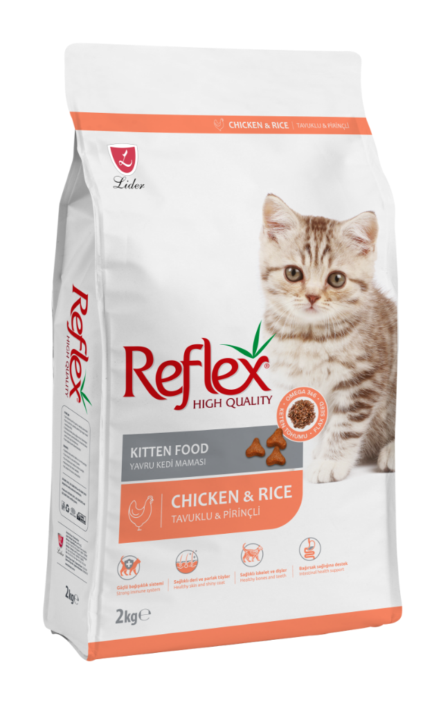 Reflex Tavuklu ve Pirinçli Yavru Kedi Maması 2kg Formülünde hayvansal protein kaynağı olarak tavuk bulunan Reflex Kitten, yavru kedilerin günlük enerji ihtiyaçlarını tam olarak karşılar. Reflex Kitten yavru kedilerin gelişimlerini destekler ve sağlıklılık durumunun devamlılığını sağlar. Kas gelişimini desteklemek için yüksek kaliteli protein bulunan formülünde bağışıklık sistemini destekleyen vitamin ve mineraller vardır. Parlak tüyler ve sağlıklı bri cilt için formülüne bira mayası eklenen Reflex Kitten kolay sindirilebilir formülüyle sindirim sistemini yormaz ve bağırsak sağlığı korunur. İçerik Kurutulmuş Hayvansal Proteini Tahıllar Mısır Pirinç Tavuk Yağı Mısır Glüteni Kurutulmuş Şeker Pancarı Buğday Kepeği Ciğer Aroması Vitaminler ve Mineraller Keten Tohumu Bira Mayası Tuz Taurin Mannan Oligosakkarit Yucca Schidigera Koruyucular Antioksidanlar Analiz Tablosu Ham Protein %37 Yağ %20 Ham Selüloz %3 Ham Kül %8 Besin Katkı Maddeleri Vitamin A 18000 IU/kg Vitamin D3 1500 IU/kg Vitamin E 200 mg/kg Vitamin C 400 mg/kg Vitamin B1 - B2 - B3 - B6 - B12 - B7 - B9 Vitamin K3 200 mg/kg Taurin 1500 mg/kg Metiyonin 1500 mg/kg Demir 200 mg/kg İyot 1,5 mg/kg Bakır 13 mg/kg Manganez 50 mg/kg Çinko 140 mg/kg Selenyum 0,3 mg/kg Kolin 3500 mg